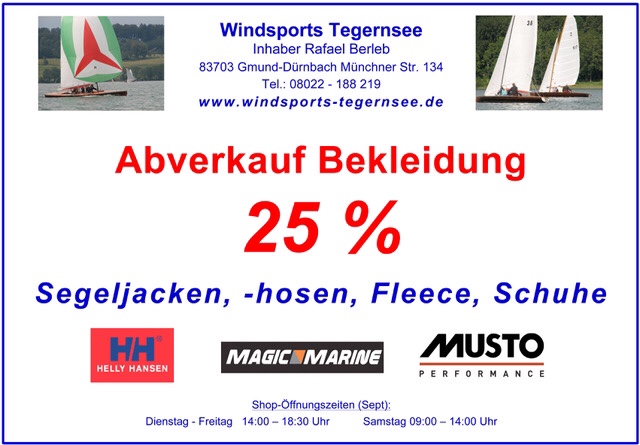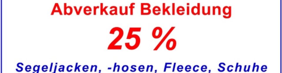 Unser Partner Windsports veranstaltet einen Abverkauf auf Bekleidung und bietet 25% Rabatt.
