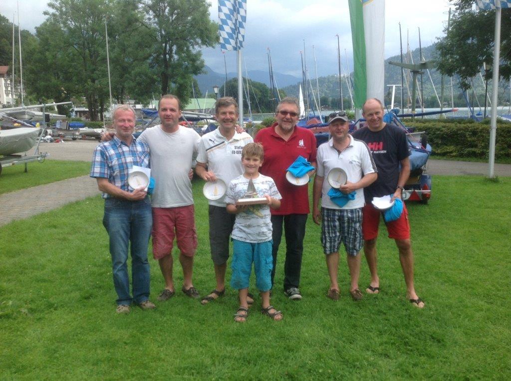 Dass dieses Wochenende doch noch so ein schönes Segelwochenende werden würde, hatte wohl keiner erwartet. Die 28 gestarteten Boote konnten am Samstag unter besten Bedingungen gerade eine Wettfahrt absolvieren, die an Stefan Beichl und Bene Wiedemann ging, als sich im Süden und Westen schon die rabenschwarzen Gewitterwolken auftürmten. Nach der ersten Runde der zweiten Wettfahrt drehte der Wind so heftig, dass die Führenden auf der zweiten Kreuz den Spi hochzogen und genau so schnell war der Wind dann auch weg. Also ab nach Hause, wenn nötig auch im Schlepp.  Das nachfolgende Hagelgewitter bewies dann auch, dass die Eile gerechtfertigt war. Abends dann traditionell Hendel und schönstes Abendrot, aber auch eine trübe Aussicht auf Regen und keinen Wind. Es sollte ganz anders kommen: Die Wettfahrtleitung schickte uns gegen die Erwartungen bei kaum Wind auf den See und behielt Recht. Drei Wettfahrten bei 2-3er NW-Wind und strahlender Sonne, was will man mehr! Stefan und Bene konnten sich mit einem weiteren ersten und einem zweiten Platz den Gesamtsieg sichern. Wie sie das genau gemacht haben, kann ich nicht so genau erklären. Mal war´s in der Mitte besser, dann wieder links oder mal rechts. Ganz ohne Patzer kam jedenfalls keiner ins Ziel. Wie man dem Gesamtergebnis entnehmen kann. Das Stockerl gehört jedenfalls der Oberbayerischen Fraktion, die teils sehr weitangereisten Segler aus Österreich, Mitteldeutschland und dem Vogtland konnten sich in diesem Jahr nicht durchsetzen. Gratulation auch an Kurt Müller und Ralf Aicher mit GER 103 auf dem zweiten Platz und GER 75 mit Christian Zbil und Paul Bichler auf dem Dritten Platz. Es gab noch einen weiteren erfreulichen Aspekt, so viele Frauen und junge Segler an der Pinne und an der Vorschot waren schon lange nicht mehr im FD am Start. Besonders erfreulich GER 1 mit Johanna Beichl an der Pinne und Sami Leitl an der Vorschot auf Platz 19, beide noch nicht volljährig!