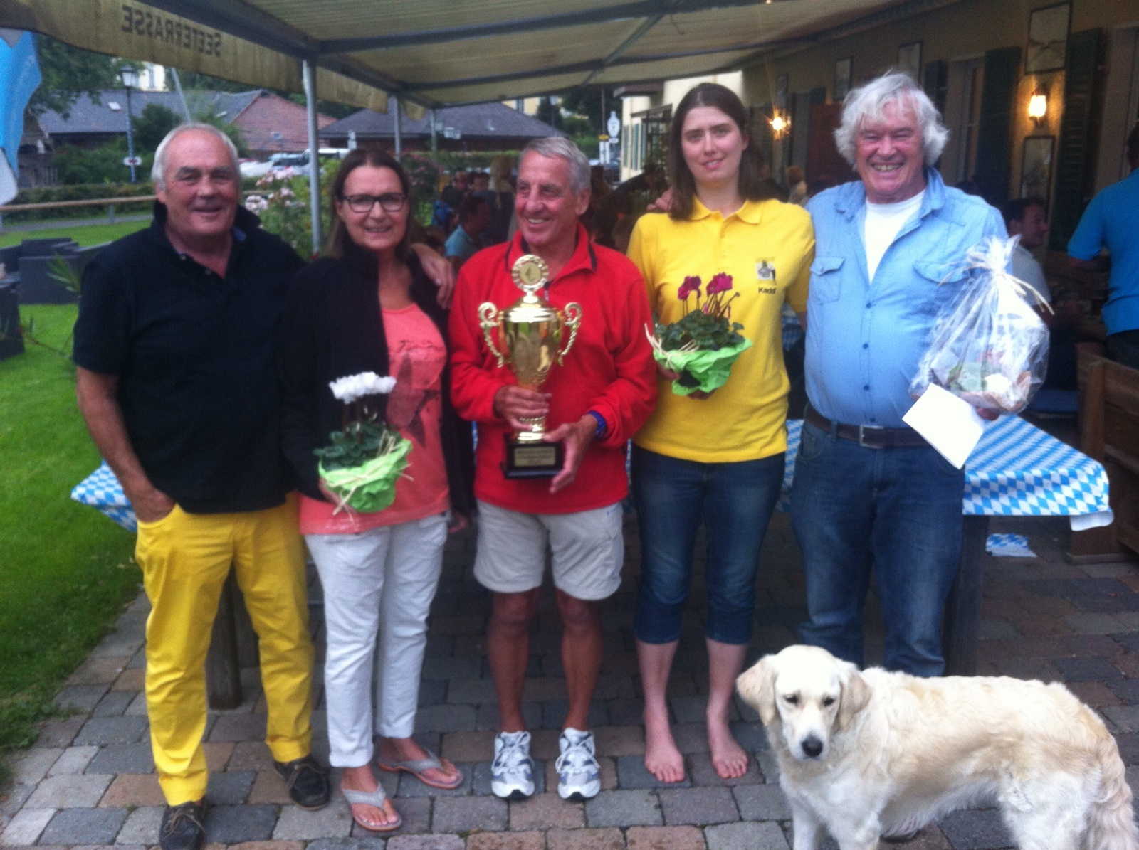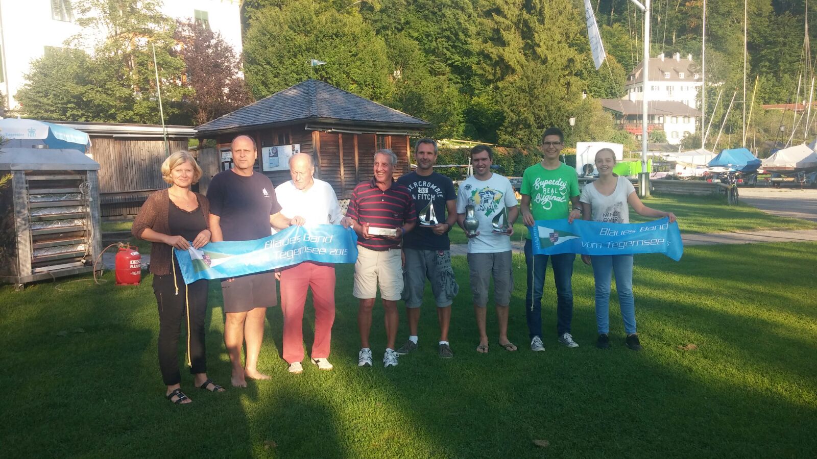 v.l.: Astrid u. Helmut Steiner – Blaues Band, Wettfahrtleiter Werner Biebl, Peter Singer – Ludwig Erhards Zigarrenkisterl als ewiger Wanderpreis für die Beste Jolle, Sebastian Liepe u. Korbian Kordes – Seemeister 2015, Philipp Rohrmoser und Julia v. Tucher